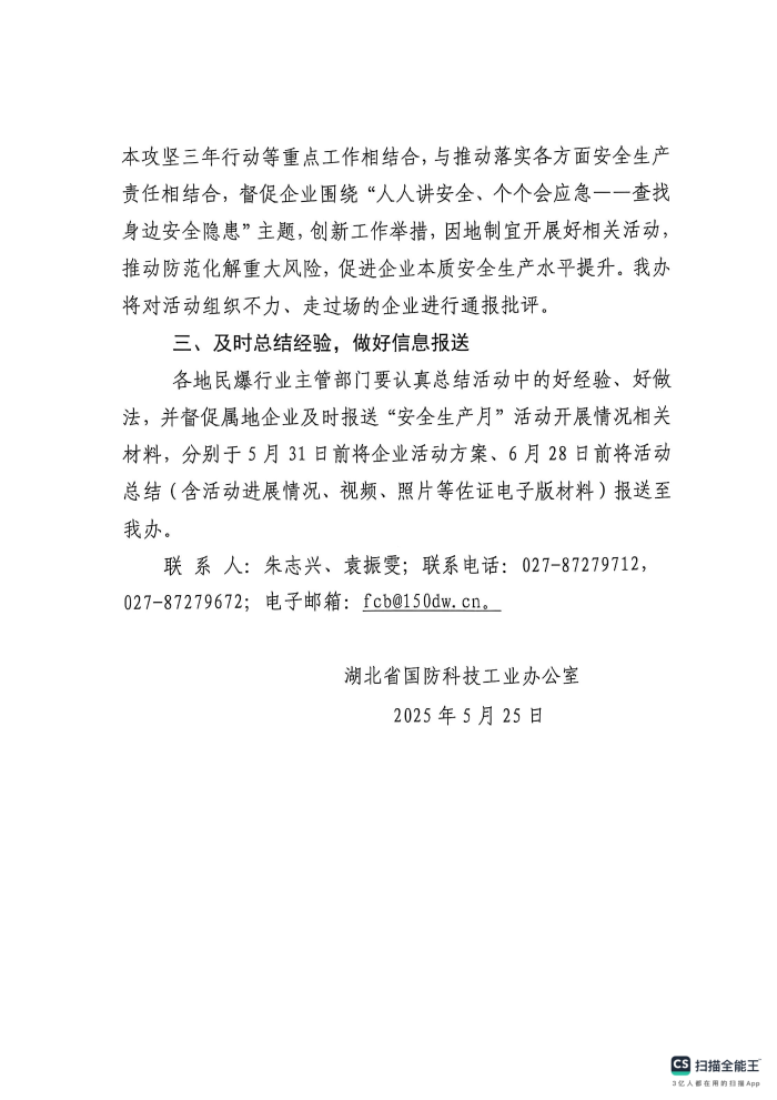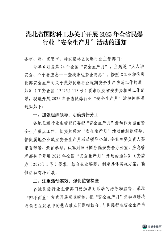 湖北省国防科工办关于开展2025年全省民爆行业“安全生产月”活动的通知
